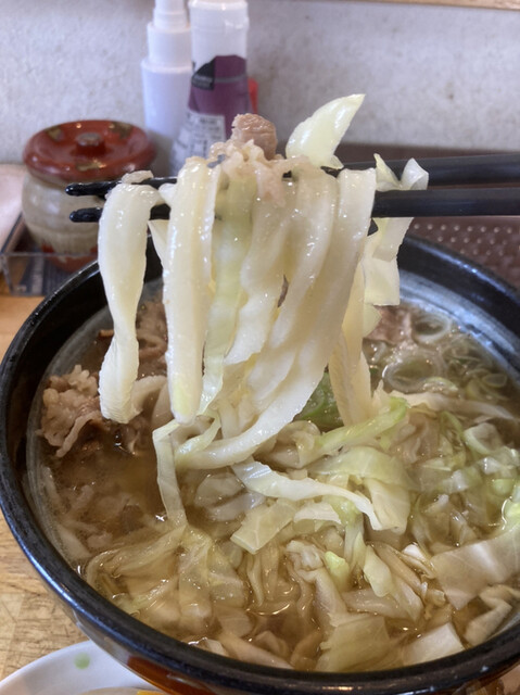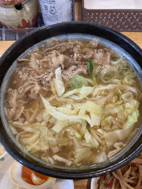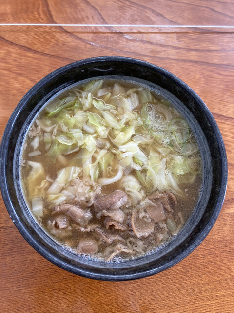 吉田のうどんスタイルなので器一面にシャキ系茹でキャベツと朝炊き甘辛牛バラで敷き詰められております。