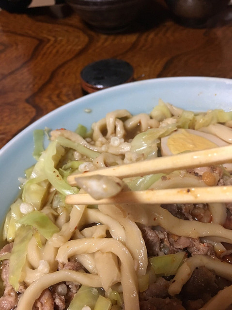 早速食らいつく。麺はカチカチで箸で持ち上げても曲がらない!ピンピンの麺!