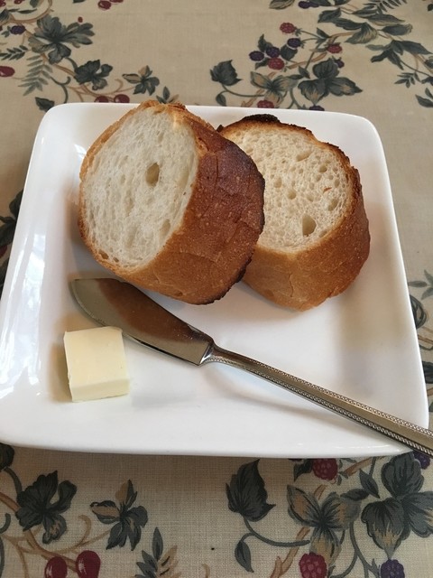 メインの前にパンが出てきますがいわゆるフランスパンにバターがひとかけらです。パリパリさっぱり美味しくいただけます。