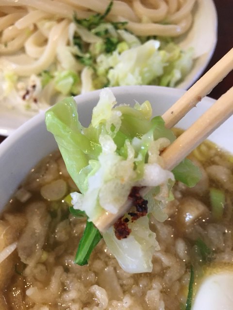 口の中に小麦の香りがふわーんと来ます!そしてつけ汁が秀逸であの極太麺に負けない存在感。醤油と味噌の合わせスープで麺に馴染む馴染む〜
