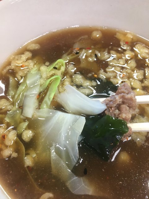 具のわかめは生のヤツで風味がよく、キャベツはクタ系でスープに馴染む。油揚げ?なんか焼いてあるやつも細切れが入ってる。