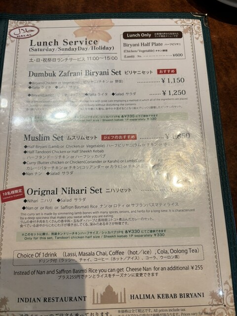 こちらではムスリムセット(バターチキン、マトンビリヤニ)とニハリセット(数量限定10人 チーズナン)、ハーフチキンビリヤニを注文。