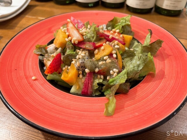 無農薬野菜のフルーツサラダは完熟、揚げ米のサクサク感のアクセントがいいです!