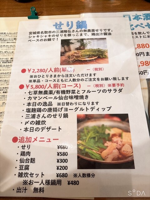 本日はせり鍋コースを注文。