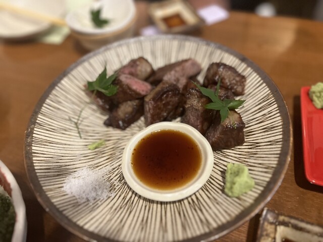 お肉料理もマスターの気まぐれでミスジのサーロイン!これも身が柔らかく肉の甘みもありウニを乗せて食べたら飛びました。