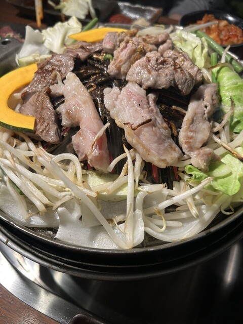 ラムの脂がジンギスカン鍋の縁に流れて、焼き野菜もとても美味しかったです。
