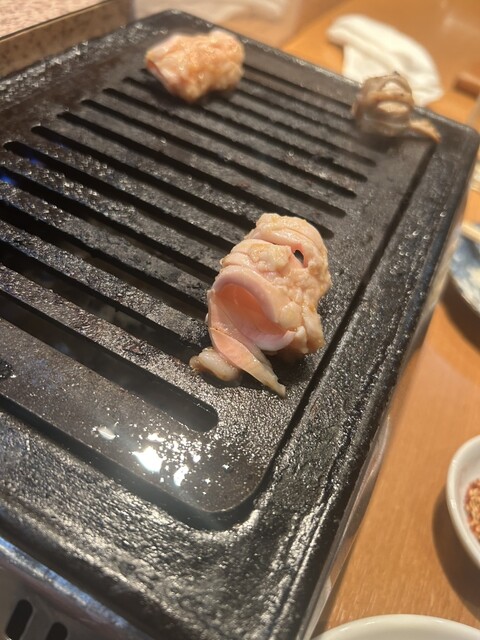 鉄板の温度が高い縁で焼きます。せんまい刺しや焼センマイと全然食感が違って新しい感覚を覚えました。鮮度が良いから色んな食べ方ができるんでしょうね。