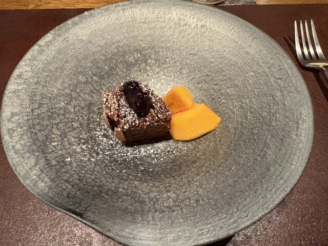 入れ物が美しい。ガトーショコラにブルーベリーソース、吉野柿
