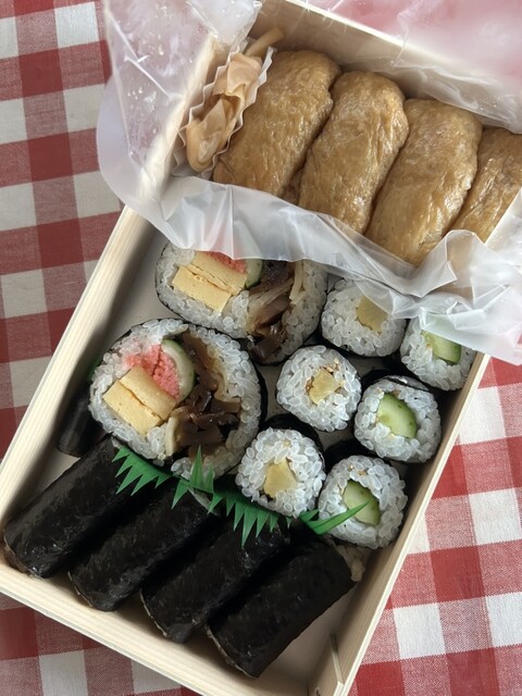 こちらは干瓢、沢庵、きゅうりの細巻、太巻、稲荷、そしてガリが入っていました