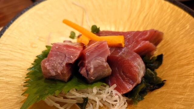 マグロブツを生卵とユッケタレに絡めて海苔で口に頬張ります!美味しいに決まってる〜♪