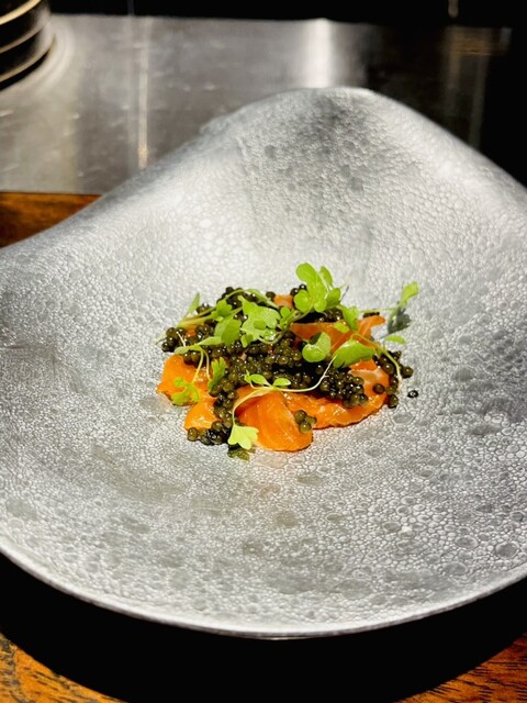 生ハムで巻いてあり、その上には渡り蟹のうちこのパウダーに贅沢にトリュフキャビアのせ