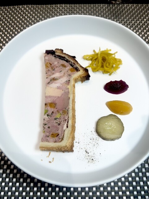 ホロホロ鳥、仔牛、近江鴨、フォアグラ、コンソメゼリー、ピスタチオ&ヘーゼルナッツを加えた絶品すぎるパテアンクルート