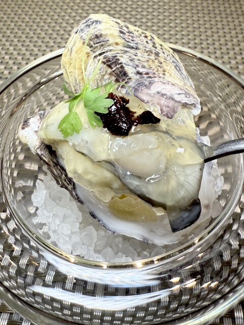 ポロネギのピューレにお野菜のお出汁と牡蠣の火入れしたジュレ