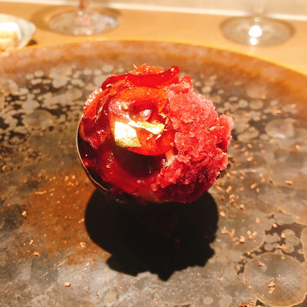 実験的一皿と言ってました. 燻製にしたヤイトカツオの上にカカオ醤を使った薬味. さらにカカオのチュイルとパウダーでカカオたっぷり. カツオの鉄分にカカオのビターな感じの相性の良さがわかります. それに醤で和えた薬味がめちゃうまい.
