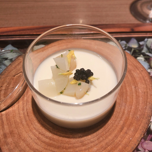 ブランマンジェの中に帆立とアスパラを落として頂きます。ホワイトアスパラがブランマンジェになり爽やかかつまろやかな仕上がり。帆立はミキュイでフレッシュさも残してあります。
