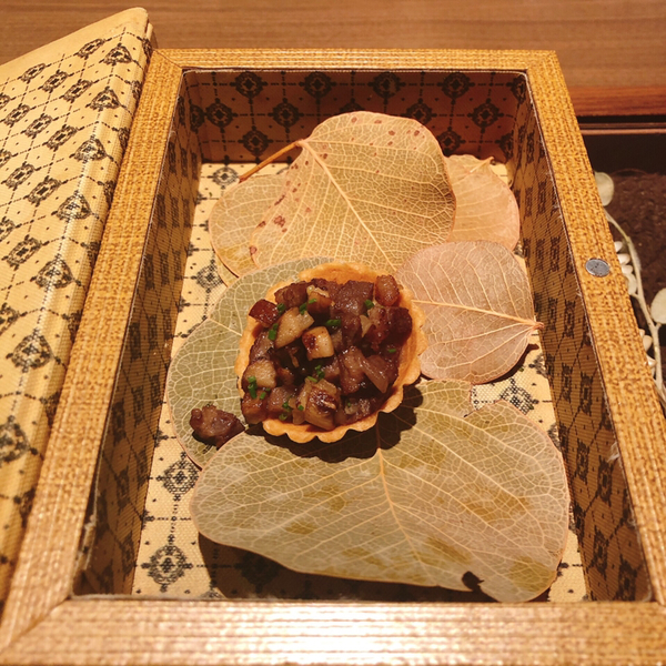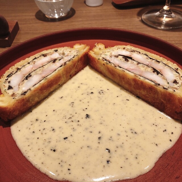 黒鮑の底に敷かれたチョリソーが憎い演出。ホタテのムースが優しい味を醸し出していて薄めのパイ生地が全体を柔らかく包んで中身の味をうまくまとめています。