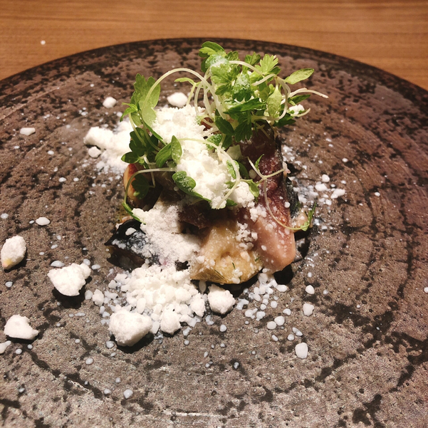 ◇しめ鯖と揚げ茄子, 無花果を液体窒素で固めたバターミルクで