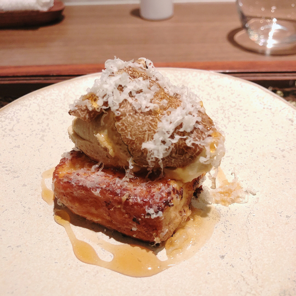 ピエドポーにクルトン生地、木の子をのせて上からサマートリュフ. ピエドポーは豚足なのに臭みがないから食べやすい.