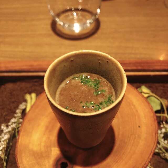 下にフランを敷いた鹿のコンソメ. 銀杏と木の子入り. 濃厚だけどクセがなくて飲みやすい.