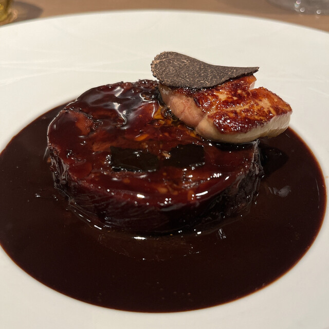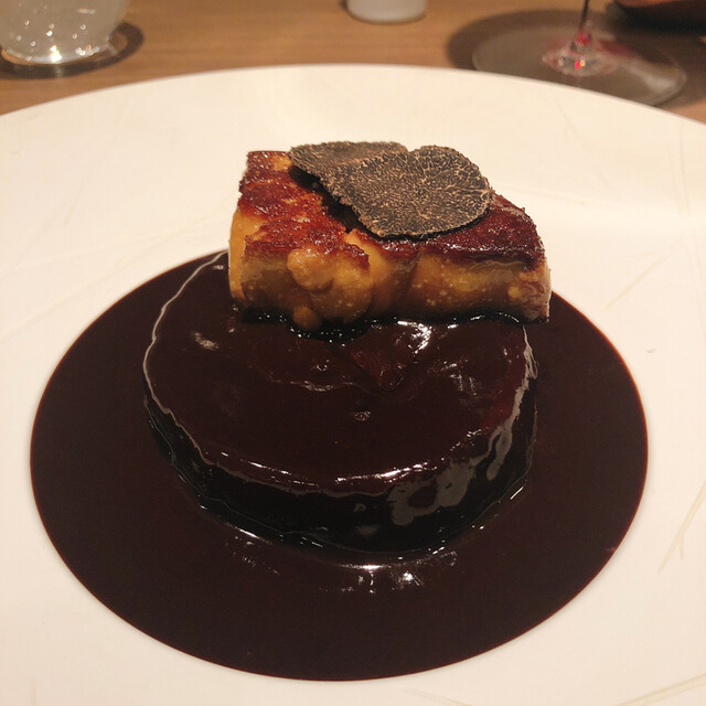 フォアグラのテリーヌ. これをたまり醤油に漬けてブリオッシュにのせてます. 鮟肝なら和食で出てきてもおかしくない味わい. 日本酒が欲しい.
