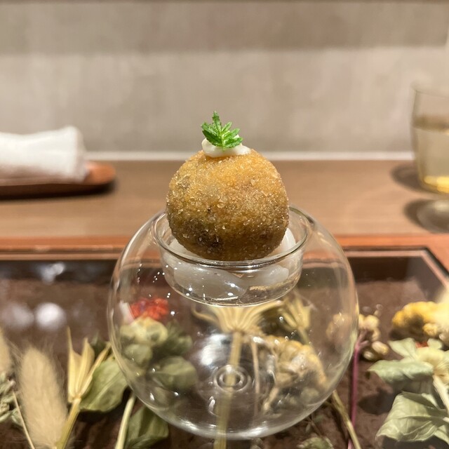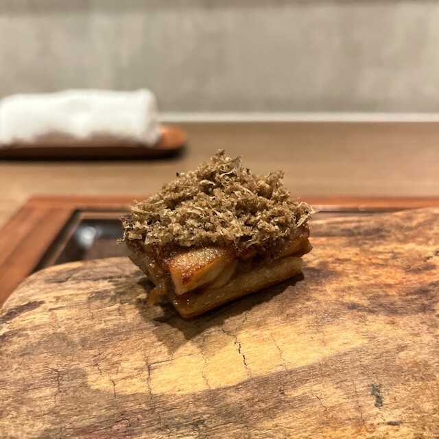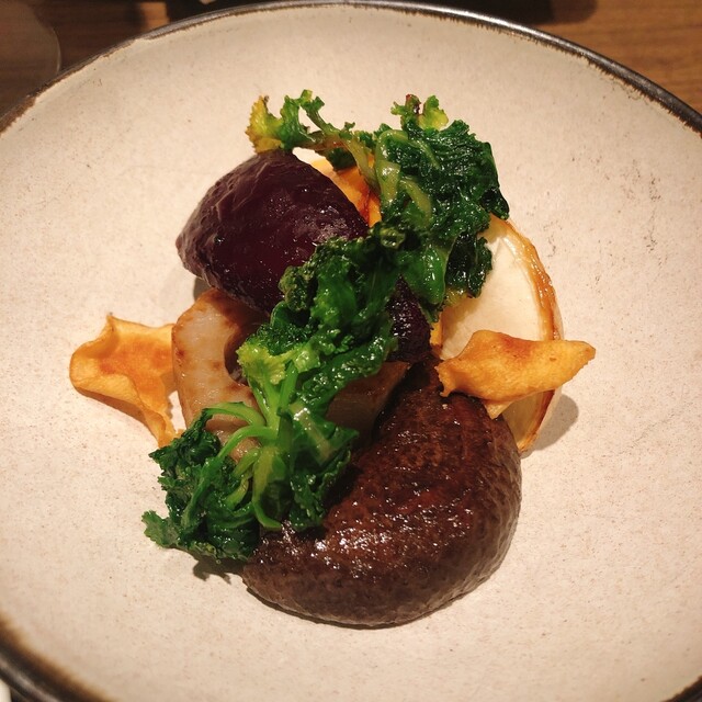 海亀のタルタルをビーツで巻いてある. タルタルは鮪っぽい味で根セロリのマヨネーズソースを絡めるとうまい. 脇に添えた蕗味噌も味変トッピングとしてなかなかです.