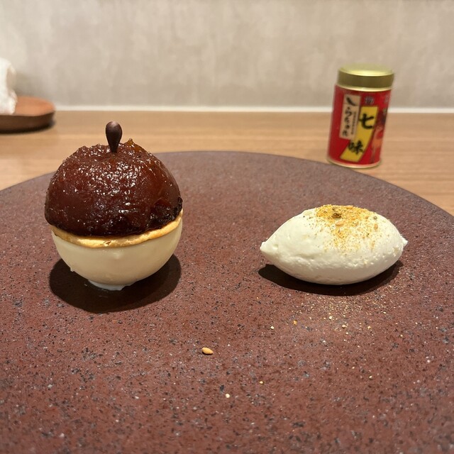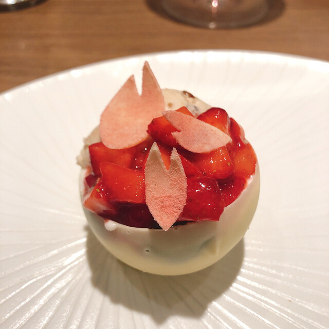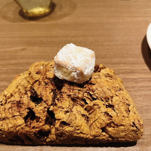 デセールは花びら餅を模したもの. 牛蒡の土台に白味噌アイス. 上には求肥. 牛蒡の風味らあるけど土臭さはなくこれはすごい.
