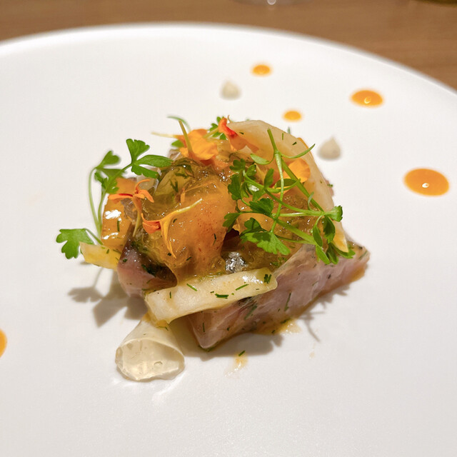 寒鰤のマリネにパール柑とナッツを和えて表面にラディッシュの薄切りを纏わせています. 鰤大根ってことですね. 仕上げはディルのオイル. ラチュレさんは魚介に柑橘を合わせてくることが多いですね.
