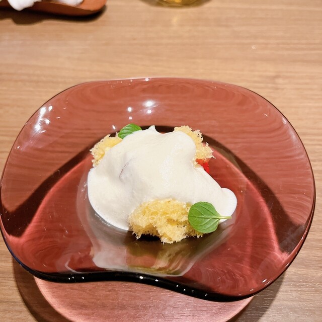 杏仁ブランマンジェの上には河内晩柑. この杏仁ブランマンジェの軽やかな甘さに柑橘の酸味がプラスされてそれだけでうまいのに桜海老を散らしてくるという驚きの組み合わせ. でもこの塩味とカリッとした食感が全体を〆る感じもします.