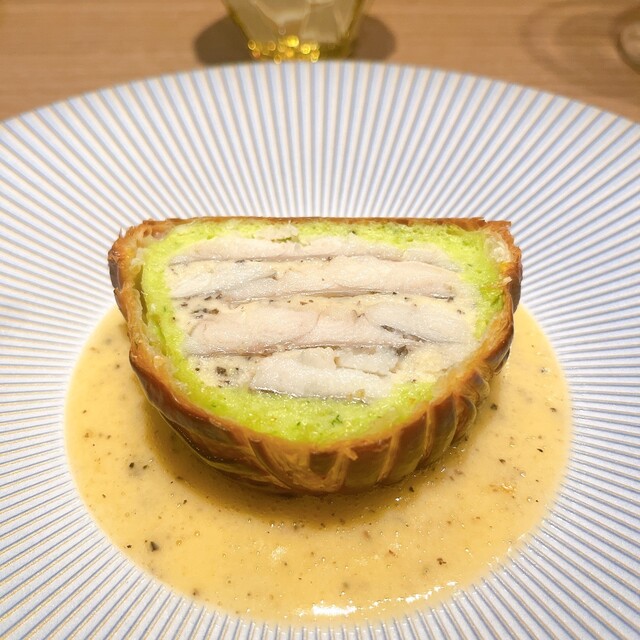 中身は確か青森の鮃. 外側は帆立とアオサノリのムース. 鮃がふんわり仕上がっています. 生地もパリサクッと. 今のところパイ包み焼きNo.1はラチュレだな. 中の茶色いところは香茸って聞いた気がする.
