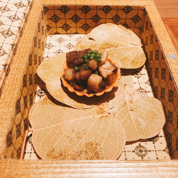 以前はマカロンだったけれど今回は木の枝のようなオブジェに挟んで登場。形も円筒形になったけどこの違いはなんだろう。マイレビュアーさんのレビューを読むと初来店と2回目以降の客かで変えているらしい。味も少し違うのだと思うけれど前の記憶がそこまでなくよく分からなかったです。口の中に入れた時にとろける独特の甘さと最後にかすかに残る野生のやや癖がある風味。