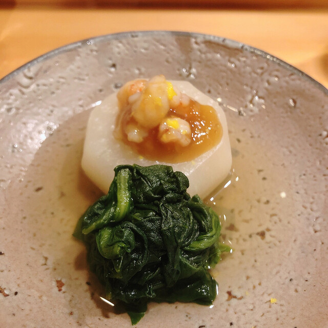 京かぶらの中は車海老. ほっくりしたかぶらに海老の旨味が染み込んでいます. 合わせたのは京菊菜. 鯛の中骨出汁を含んで味わい深い.
