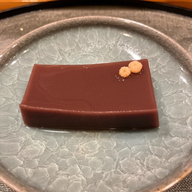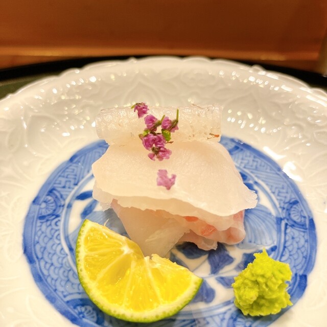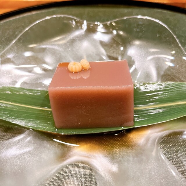 縞海老の下には百合根を炊いたものと豆腐. 食感としては茶碗蒸しに近い. ジュレは鯛の中骨から取った出汁でこのジュレがまた美味しい.