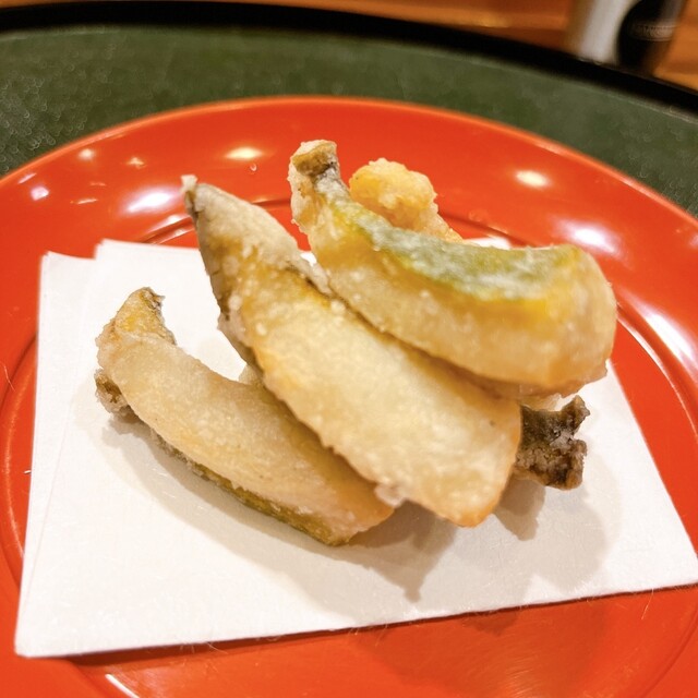 この日の揚げ物は松茸と玉蜀黍に新銀杏. 秋ですね. 松茸は岩手産. フライになって薫りがたまりません. 塩や酢橘もいいですが添えたソースで食べるのもなかなか良いですね.