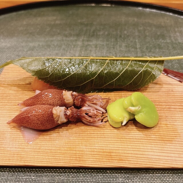 やっぱり筍が来ました♪ この日の筍は京都大原の白子筍だそうです. 皮ごと焼いて蒸し焼きにした筍を今年は煮切りでいただきます. 去年は塩だったな. みずみずしくて水分が口中に迸ります. うんまい.