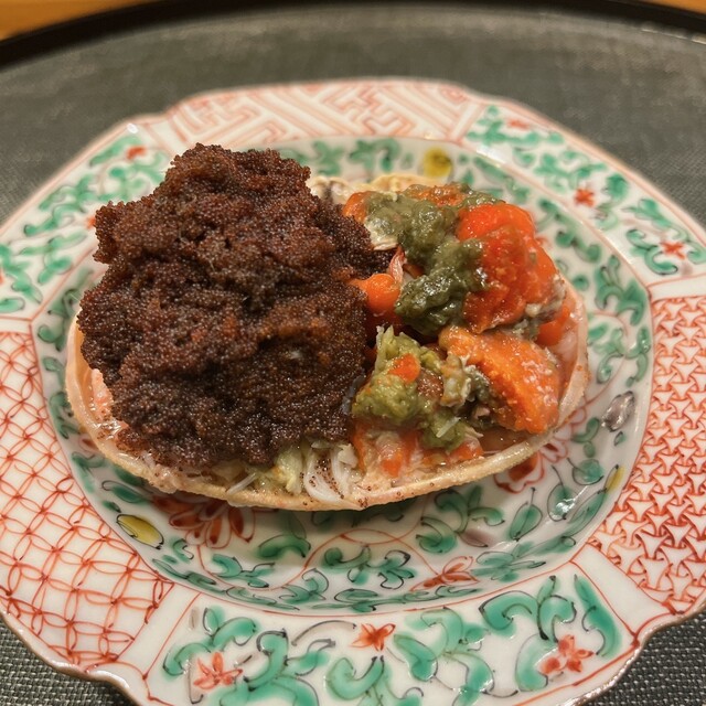 やはり出ました香箱蟹. 外子に少し強めに火を通してシャリっとした食感にするのが井上流. 土佐酢との相性も抜群で日本酒が進みます.