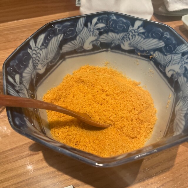 トマト100%エキスのスープに入ったカッペリーニ.ここにハーブサラダと間人の香箱蟹の身を入れて頂きます. 斬新な食べ方だけど、スープと蟹がピッタリ. 味変で自家製唐墨パウダーを大人掛け. 調子に乗ると塩気が増すので注意.