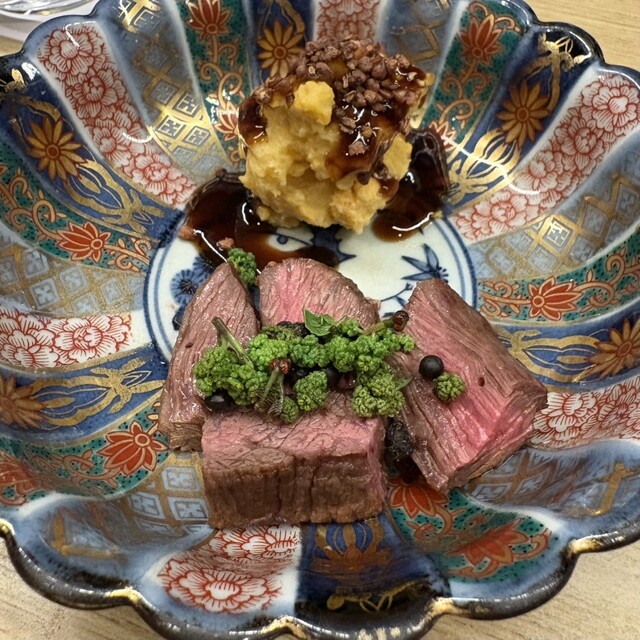 枝豆にはじまり、あおりいか、つぶ貝(肝のみ軽く味付け)、あじ、白甘鯛とお刺身が続き、ここから火入れ。次は鱧かと思いきや、鱧にしか見えない穴子。この時期は、穴子の方が脂がのっていてうまいらしい。歯ごたえ良く、しっとりとして激うま。さわら、黒むつ(うますぎて撮り忘れ)、ほたて、たいらぎ貝。続いては、これまた擬態がすぎる本まぐろ大トロのあぶり。わさびをたっぷりのせて、口に入れた瞬間にとろけた。さっぱりと、脂のうまみで口内が満たされる。中締めの太刀魚丼。肉厚でふわふわの太刀魚を皮ごとしっかりほぐして、ごはんと混ぜていただく。口に運ぶ前から香ばしくてよだれが止まらん。珍味は、定番のこれだけで日本酒四号いけるうにの佃煮、チーズと見紛うほど美しいあん肝。とろとろに牛肉が煮込まれた肉吸い、締めは世界一のポテサラ(蕎麦の実、タマリソース)とカンボジア生胡椒の塩漬けがのった牛のあぶり。