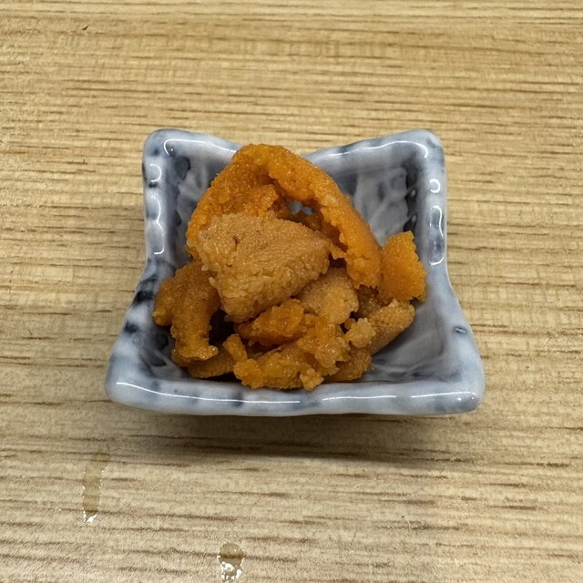 アスパラとハリイカのバターいため(雪塩)から締めに向かう流れで、待ちに待ったウニの佃煮。これだけで日本酒2合はいける。あん肝、チャンジャと珍味が続き、花山椒が散らされたヒウチ、ヒシ梅タマリソース、そばの実といただくポテサラ、最後にふぐ白子とだし卵黄でいためたごはん。