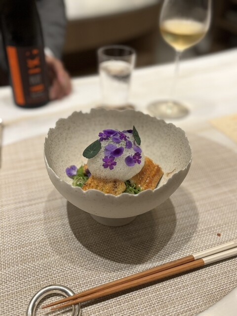 鰻関西風、加賀太きゅうり、やめちゃの昆布だしの泡、ブーケサラダ