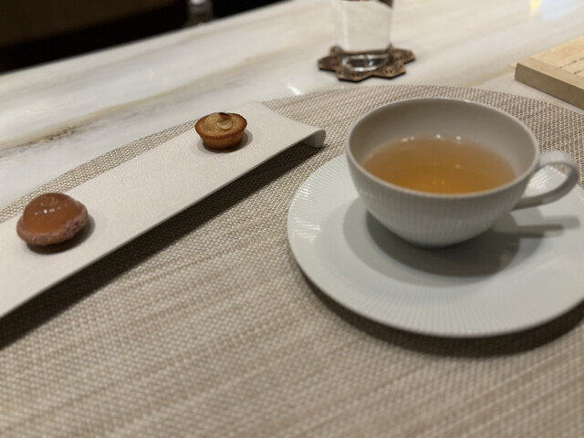 真鯛、鯛の骨髄を煮詰めたジュレ、ホワイトビネガー、焼いた松茸、サンセプトプラム、酢橘、はなほじそ