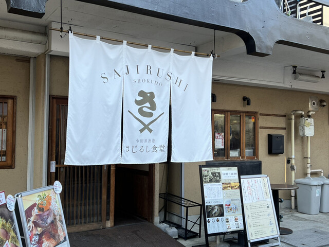 先ず席を確保、メニューを見て、注文決めて、入口の券売機で食券購入。2回目なんでスムーズな流れ。「特製さじるし海鮮丼」「アジ孫茶漬け御膳」「アジのなめろう」そして「半生アジフライ」。
