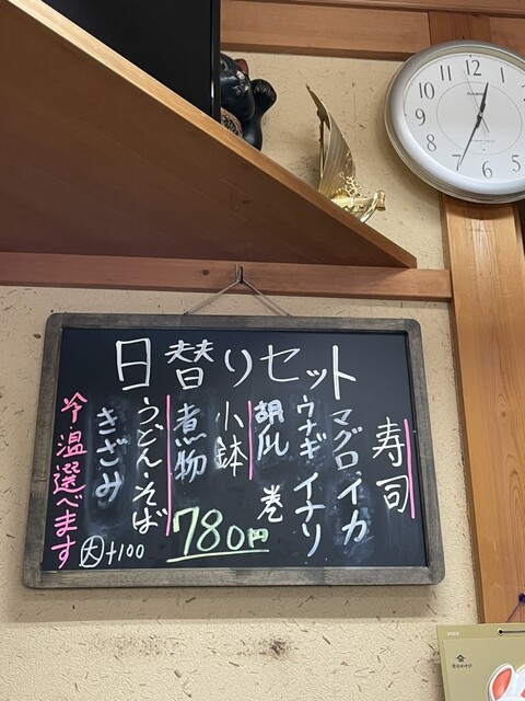 イカ、マグロ、うなぎの握り寿司と巻寿司、いなりと冷たいミニそば、南京煮物の小鉢がセットになった日替りセット780円を注文。