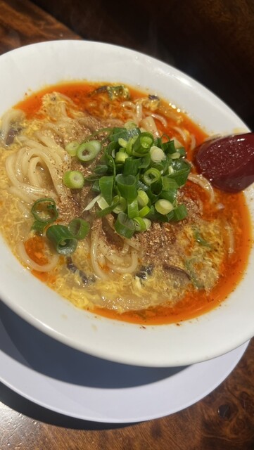 真っ赤なスープにネギミンチ玉ねぎのタワーがかなり興味をひくビジュアル。