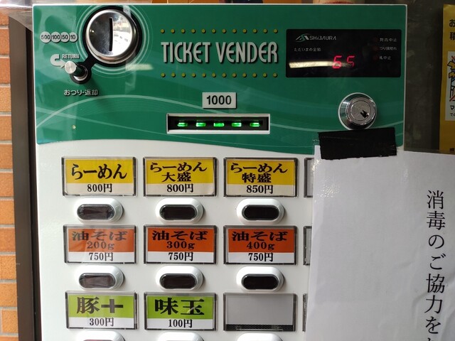 開店に合わせてお店に到着。先客は3人だった。定刻に営業開始で入店して券売機で食券を購入。いつも特盛だったのに、なぜか間違えて大盛を買ってしまう痛恨のミス。前にも同じようなミスをやったことあったけど、またやってしまうとは。。。