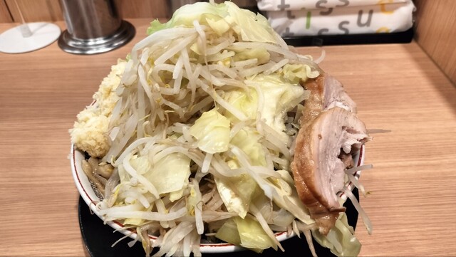 前回も感じたけど、野菜のマシマシが少なくなったような気がする。連れの野菜マシとほとんど変わらない感じだ。高く盛らなくしたのか、それとも昔食べたのがたまたま山になっていただけなのか、それでもボリューム的には申し分ない。しかも他店と違うのはキャベツ比率の高さ。今回は特にキャベツが多く、嬉しい限りだ。