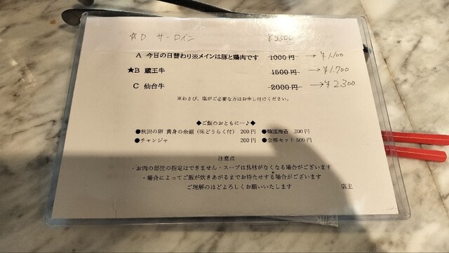 メニューを見ると『A今日の日替わり1,100円』『B蔵王牛1,700円』『C仙台牛2,300円』『Dサーロイン2,500』の4種類のランチメニューがあった。土日でもランチメニューがあるのがありがたい。Aはいくら安いとは言え豚と鶏のミックスなので無し、今回はBでオーダーする。足りないことも想定して追加で『ちょいカルビ』『ちょい赤身』『ホルモンミックス』もオーダーする。