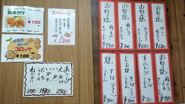 ホテルからテクテク歩いて16時45分に到着。店内に入ると先客はなし。年配のお母さん(おばあさん)が座ってテレビを眺めていた。店内はカウンターが3席、テーブルが3席で、狭くてどこか昭和を感じる店内。カウンター席に座り、お好み焼き肉玉子入りそばをオーダー。メニューに見当たらなかったのでW(ダブル)にできるか聞いてみたところ大丈夫とのことで、そばW(ダブル)でお願いする。