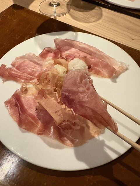 一口サイズのライスを生ハムで包んで食べるスタイルが