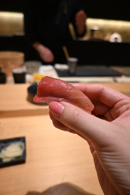 同行者のナンバーワンは小肌とのこと。こちらは酢ではなくて、シェリービネガーで〆ているので、臭みがないのはもちろん、よりうまみが強い仕立てでした。他にも金目鯛は皮なしで提供することで脂がすくないさっぱりとした口当たりで、マルドン塩という素材を引き立てるようなイギリスのこだわりお塩を使用しているなど、お鮨のベースはしっかりと守りながら色々工夫されているのを楽しめました◎