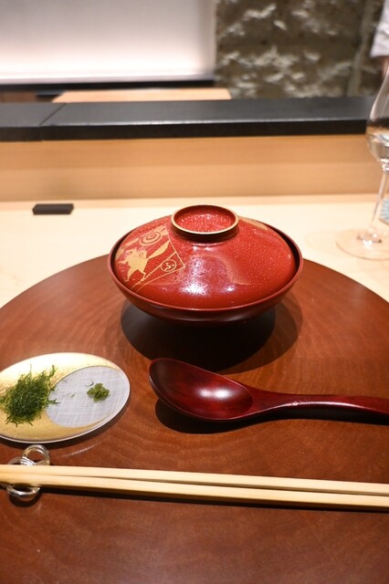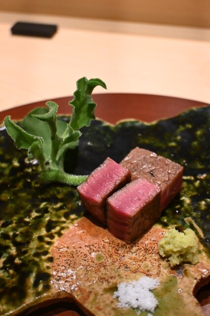 群馬県産の和牛だそうで、群馬県の形をした器で出てきました。遊び心たっぷり。お肉は柔らかで、脂が甘い。コースの終盤なので、ワサビでさっぱり頂くのがよかったです。